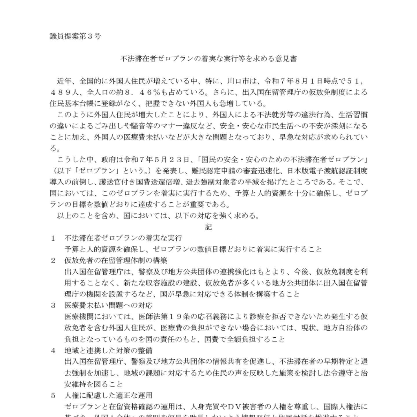 本日9月議会に向けた議会運営委員会に於いて自民党川口市議会議員団より意見書の提出を提案いたしました。内容は【不法滞在者ゼロプランの着実な実行等を求める意見書】と【外国人による交通事故の防止と被害者の保護・救済措置を国に求 […]